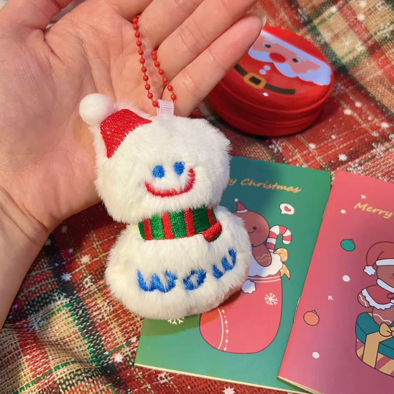 • Fluffy Snowman Keychain - Soft plush snowman with red glitter hat, striped scarf, and blue button details