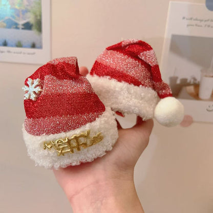 Festive Santa Hat Design: This miniature Santa hat features a glittery red fabric with white trim and a fluffy white pom-pom. The golden 'Merry Christmas' lettering adds an extra touch of holiday magic. Some styles include a cute snowflake embellishment.
