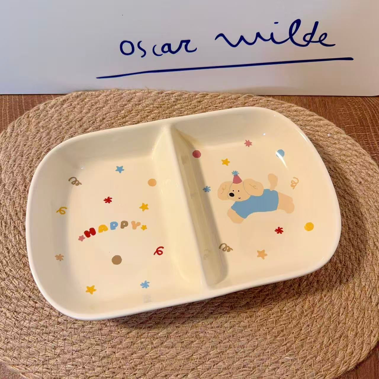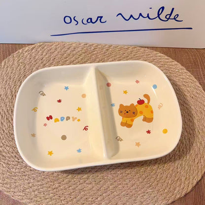 Adorable Cat & Dog Designs: This absolutely charming ceramic divided plate features two cute designs - an orange cat with a cherry on its tail and a happy bear in blue outfit with a party hat. Both are surrounded by delightful "HAPPY" text, colorful stars, dots, and playful decorations!