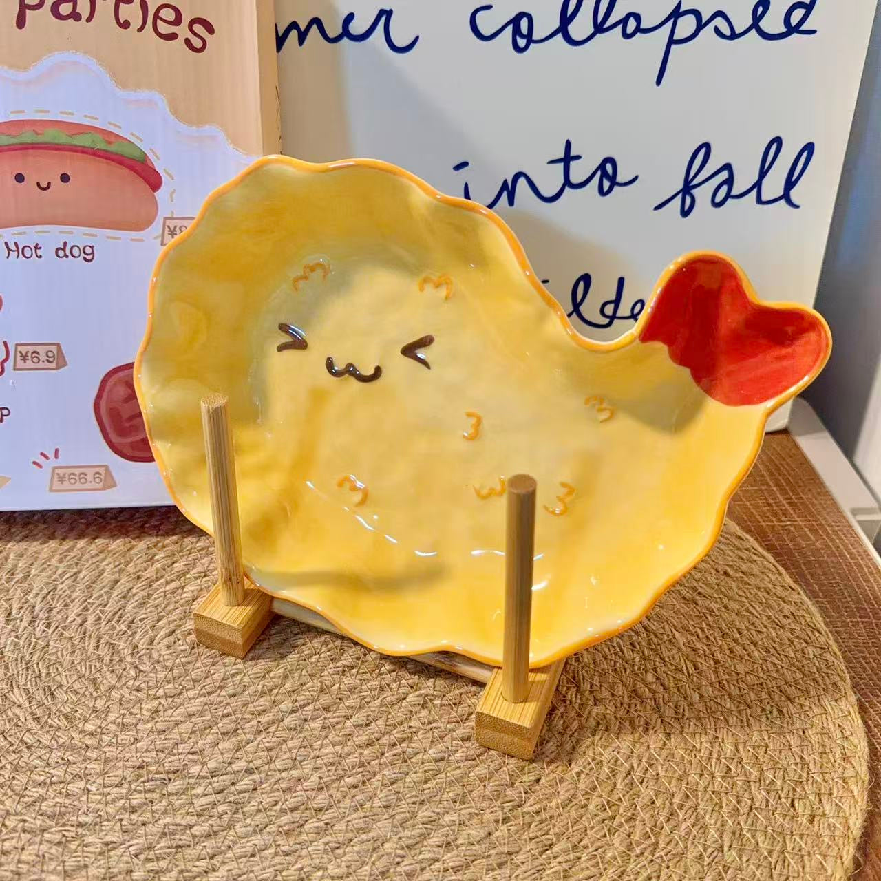 Adorable Fried Shrimp Shape: This absolutely charming ceramic plate is shaped like a cute fried shrimp with a sweet smiling face (closed eyes and happy smile), rosy pink cheeks, and an adorable red heart accent on the side. The playful design brings joy to every meal!