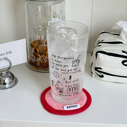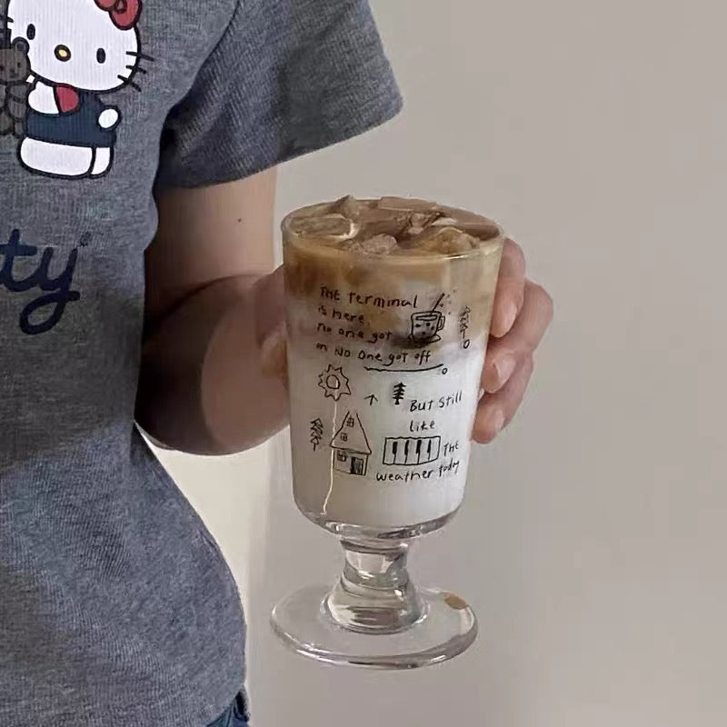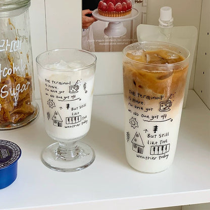 Hand-Drawn Doodle Design: The cup is wrapped in simple yet expressive line illustrations and whimsical handwritten text, adding a playful artistic touch to your daily drinks.