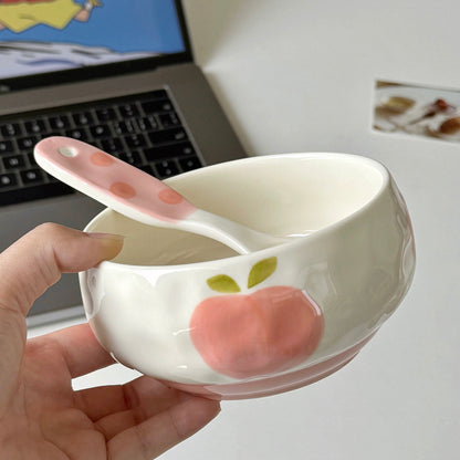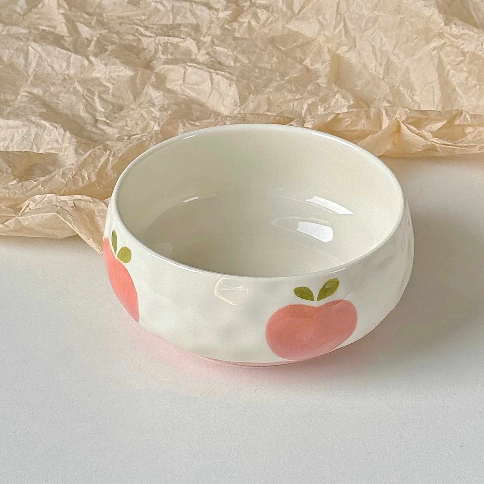 Adorable Hand-Painted Peach Design: This charming ceramic bowl features beautiful hand-painted pink peaches with green leaves, creating a sweet and fresh look that brightens up your breakfast or snack time.
