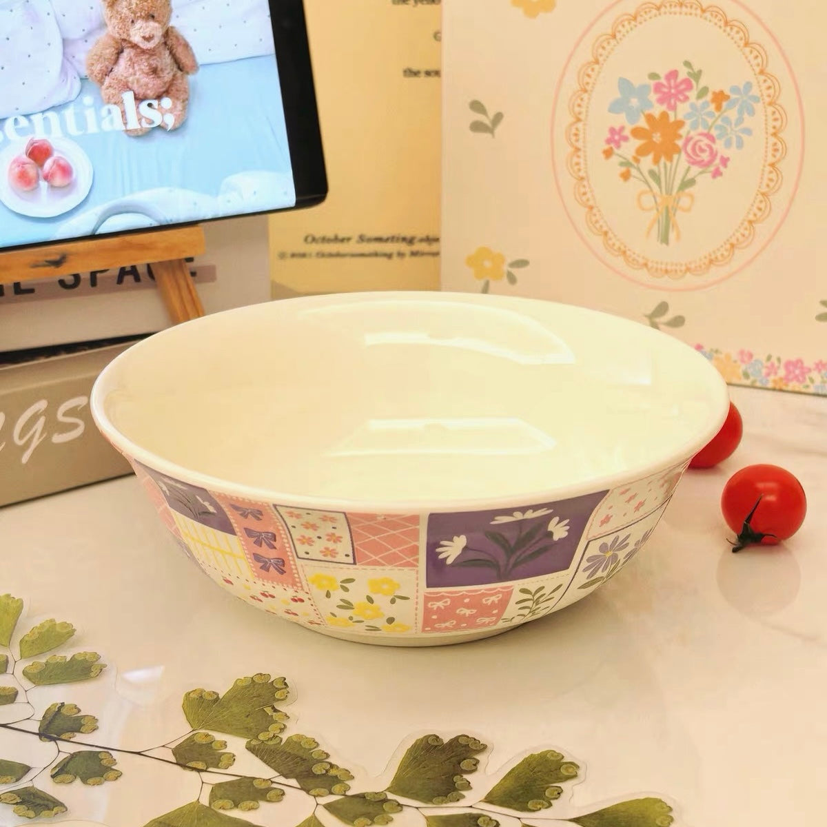 Charming Vintage Patchwork Design: This beautiful ceramic bowl features an intricate patchwork-style design inspired by vintage cottage aesthetics! Each panel tells its own story, all framed together like a beautiful fabric quilt.