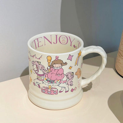 Adorable Cartoon Floral Designs: This absolutely charming ceramic mug collection features four whimsical designs with cute cartoon characters and delicate floral illustrations. Each design has its own unique personality and cheerful message inside the rim!